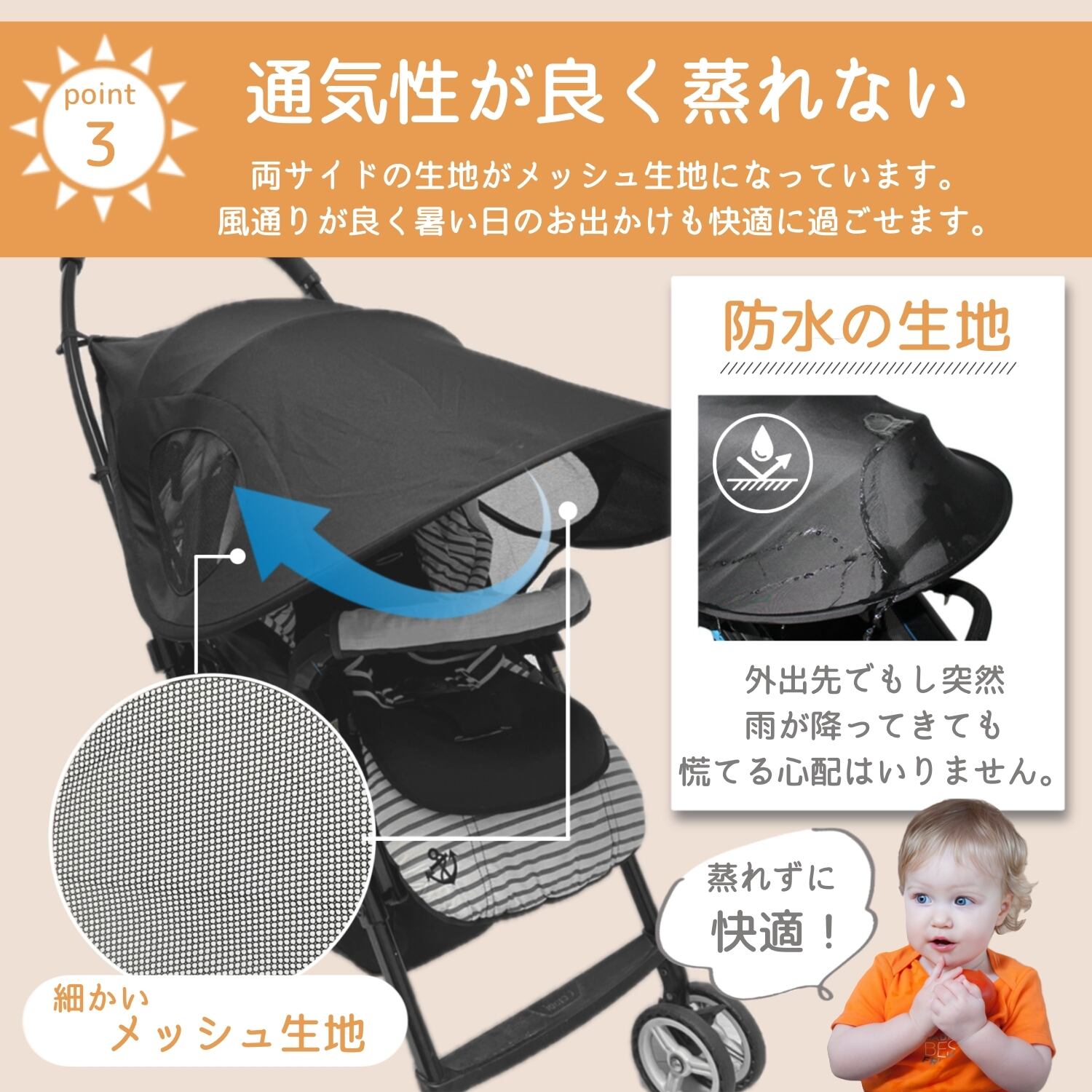 両サイドの生地がメッシュ生地になっています。サンシェードですっぽり覆っても、ベビーカーの中は通気性が良く熱がこもりません。暑い日のお出かけも快適に過ごせます。