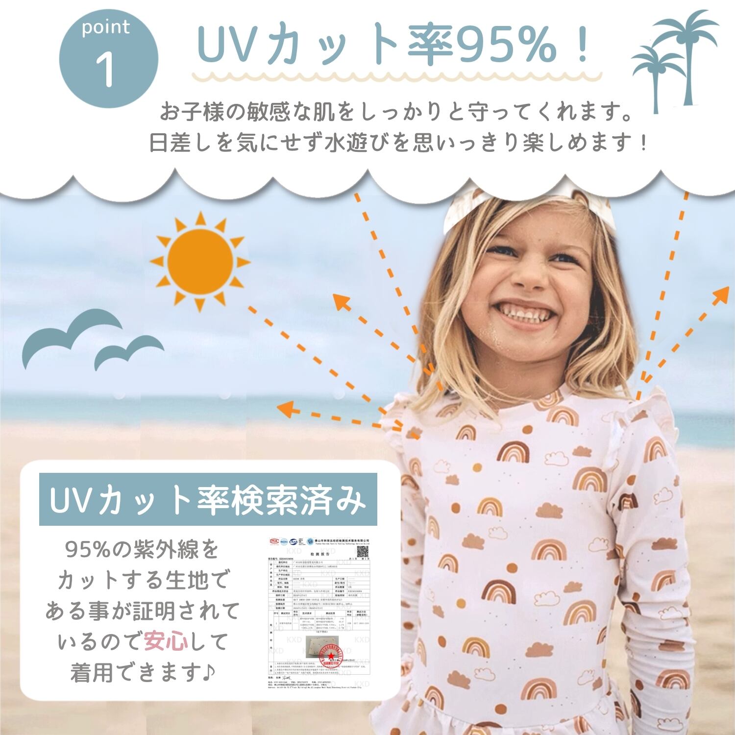 UVカット率が95%以上である事が検査済みの水着です!強い紫外線から、お子様の敏感な肌をしっかりと守ってくれるため、日差しを気にせず水遊びを思いっきり楽しむ事ができます♪初めての海やプール遊びにもピッタリな水着です!