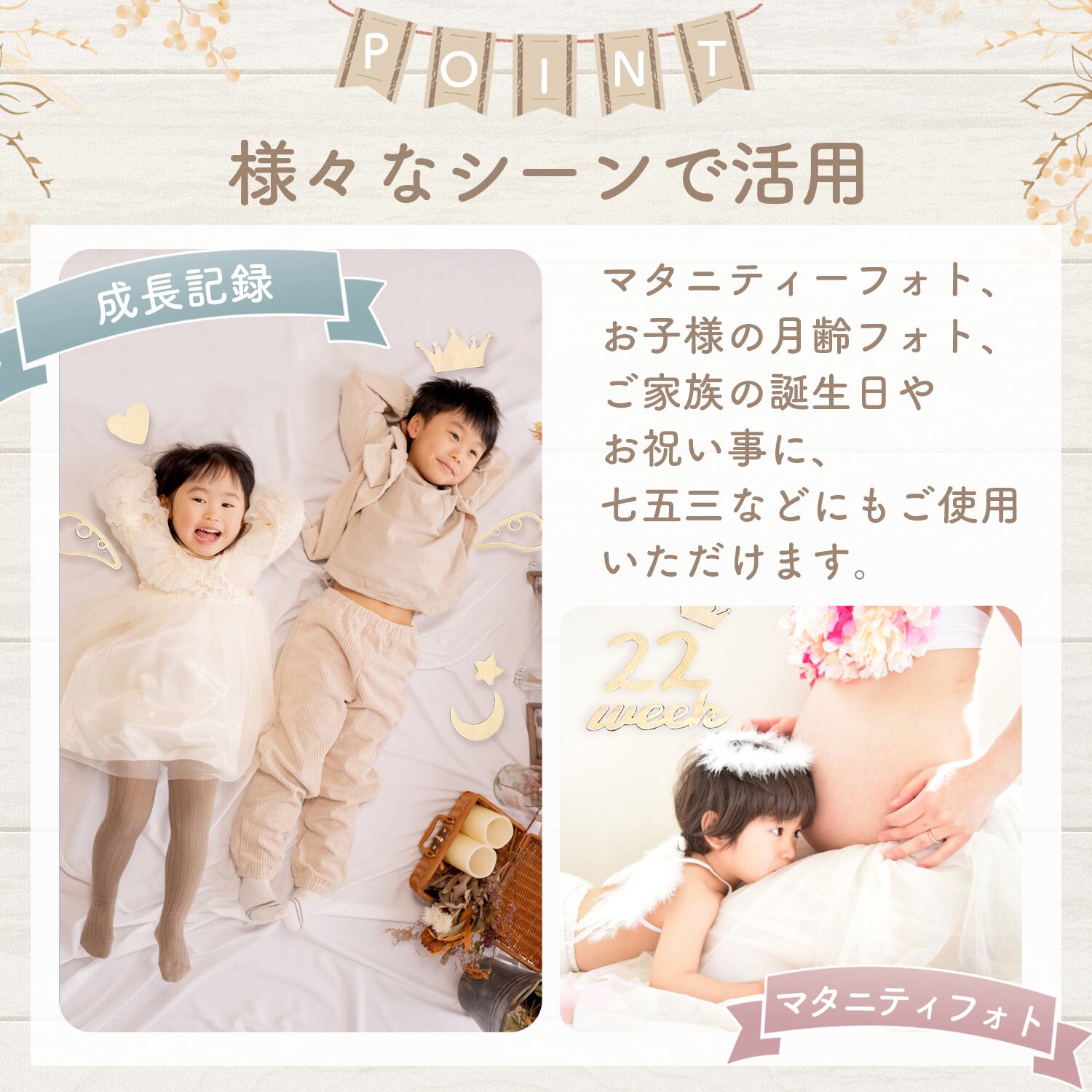 マタニティーフォト・お子様の月齢フォト・ご家族の誕生日やお祝い事・七五三など、様々なイベント・シーンでご使用いただけます。