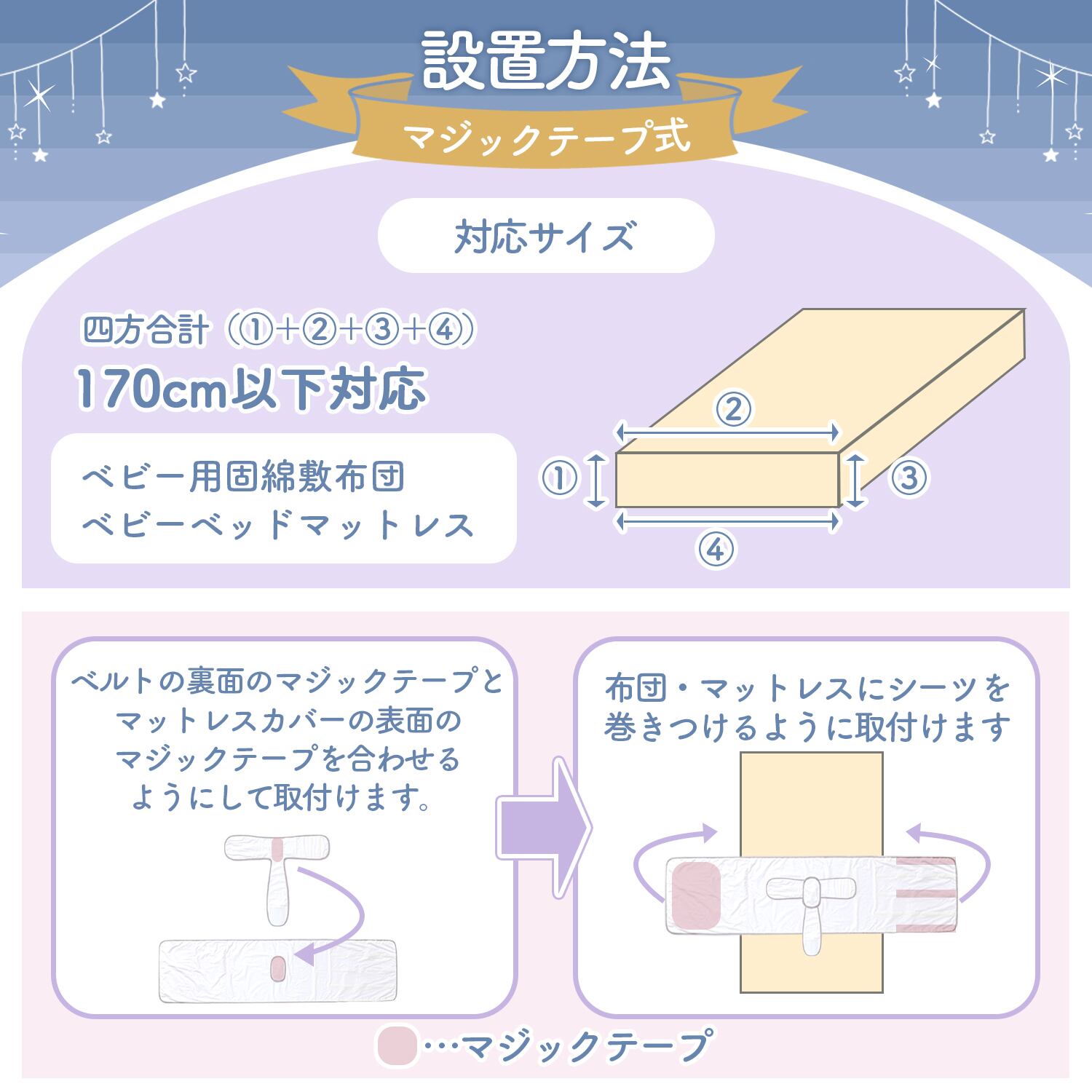 ・本製品はベビー用敷布団(固いタイプ)・ベビーベッドのマットレス専用のうつぶせ寝、寝返り防止ベルトです。柔らかい布団でのご使用はベルトが歪み、布団ごとお子様の上に被さってしまう可能性がございます。