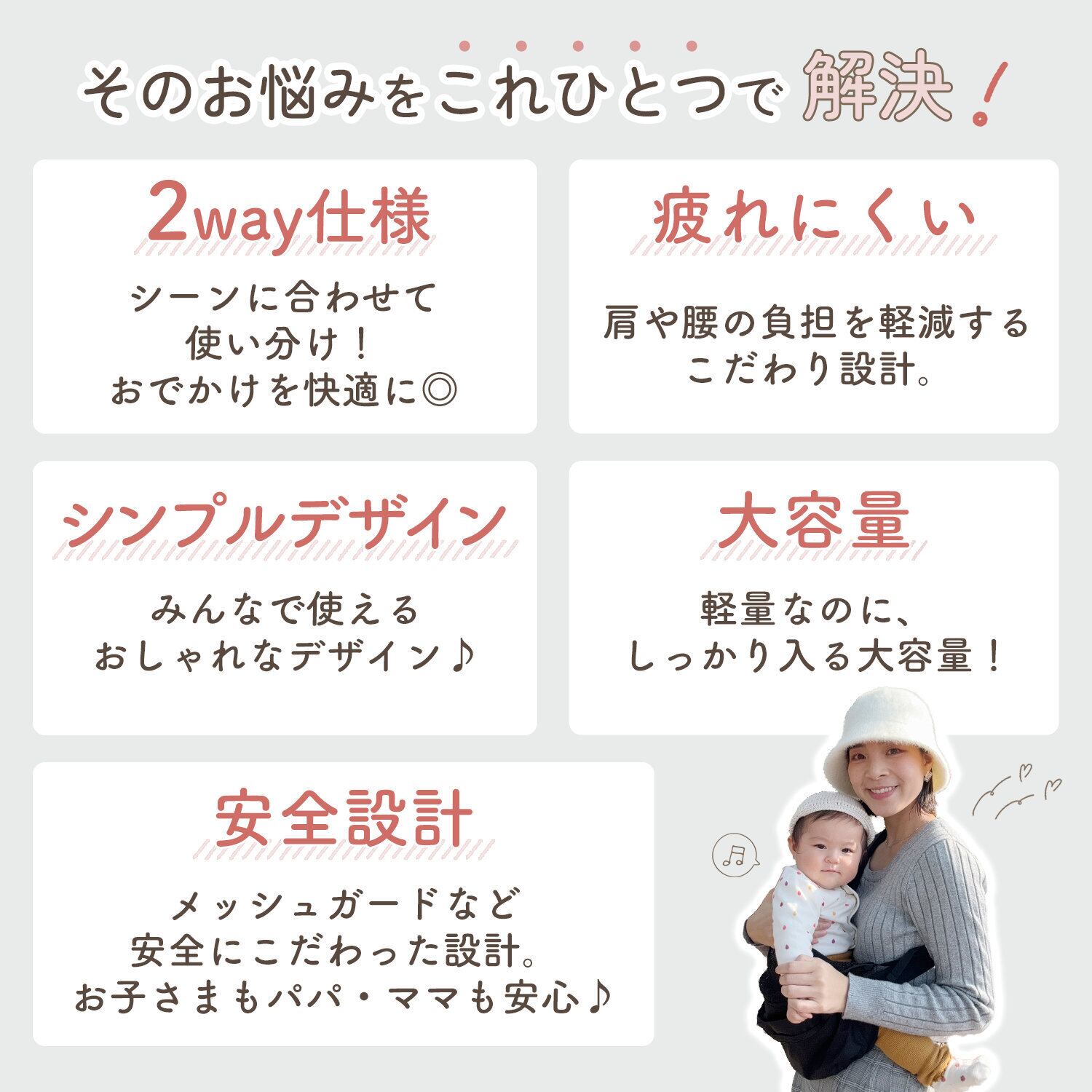 お子様とのお出かけをもっと快適にする2wayショルダーバッグ。ショルダーの長さを変えるだけでヒップシートに早変わり。お出かけ先での急な「抱っこ!」にも慌てず対応できます。