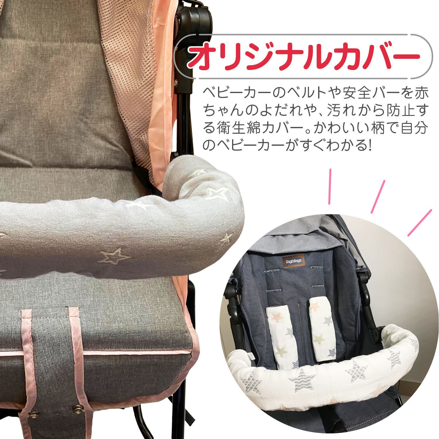 ベビーカーのベルトや安全バーを赤ちゃんのよれや、汚れから防止する衛生綿カバー。かわいい柄で自分のベビーカーがすぐわかる!